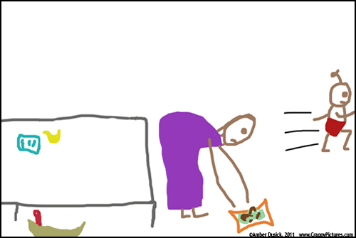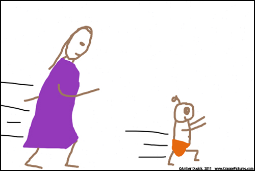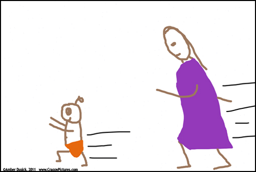 By the time I bend down to deal with the dirty diaper, he has already flung himself from the mat and is out the door.